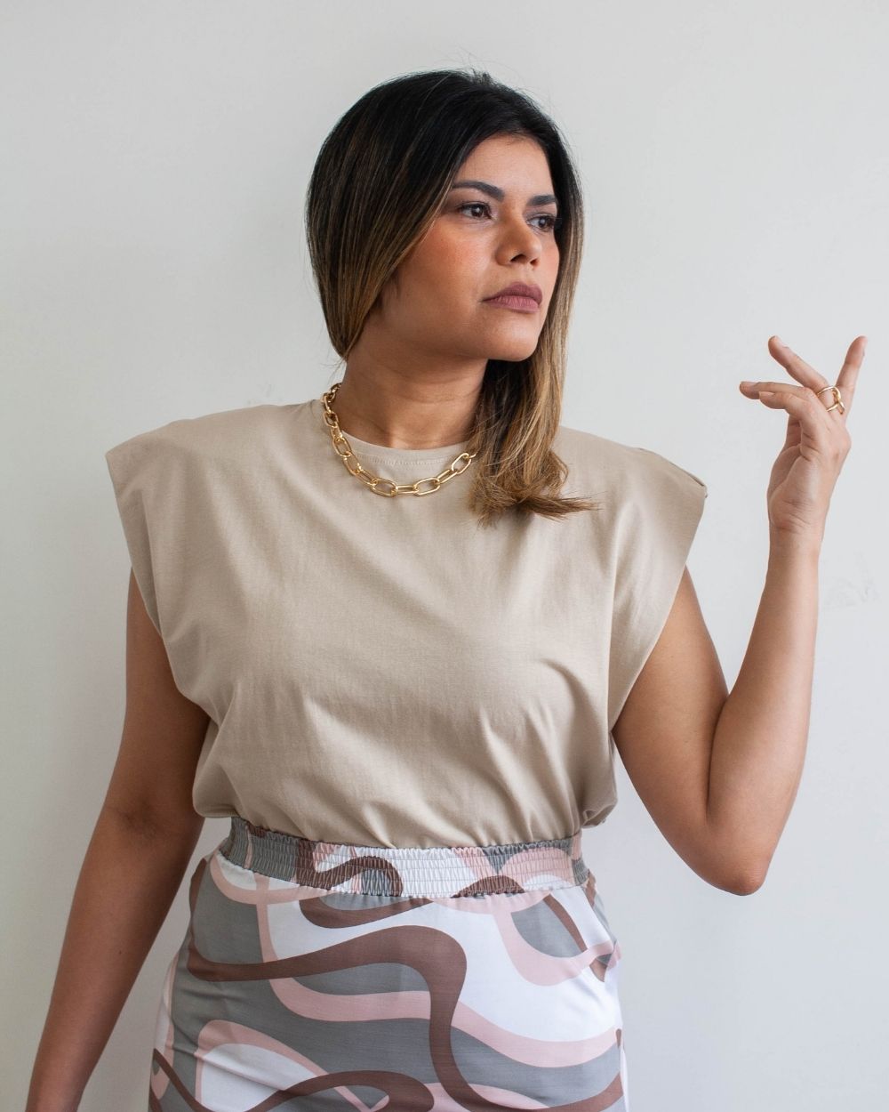 A Blusa Joana tem a modelagem da famosa muscle tee, e as suas ombreiras dão um toque todo especial a peça que acaba saindo daquele básico óbvio.